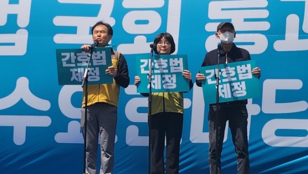 13일 간호법이 국회 본회의에 상정될 예정인 가운데 한국노총은 “사회적 돌봄의 공적 가치와 국민 건강권 보장을 위한 간호법 제정을 강력히 촉구하며 국회와 정부는 더 이상 직역 갈등에 흔들리지 말고 국민의 건강권을 위한 간호법을 조속히 제정해야 한다”고 밝혔다. ▲ 12일 ‘간호법 국회 통과 촉구 수요 한마당’에 참석한 신승일 전국의료산업노동조합 위원장(좌) 한국노총은 성명을 내고, ”현행 …
