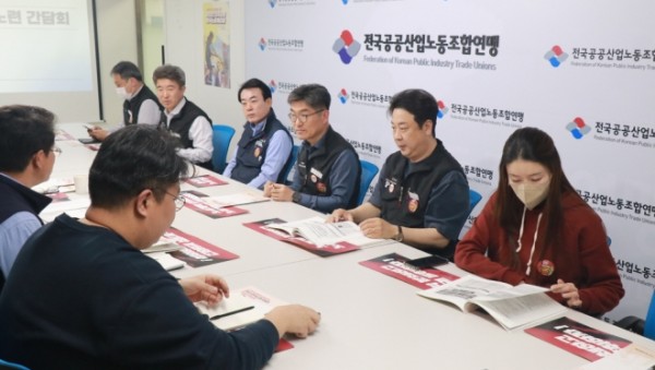 노동절 전국노동자대회 조직화를 위한 회원조합 순회 간담회가 12일 오후 전국공공산업노동조합연맹(공공노련) 회의실에서 열렸다. 강석윤 한국노총 상임부위원장은 인사말에서 노동자대회 참석을 독려하고, “현 정부도 역대 정부와 마찬가지로 노동개혁을 한다면서 가장 먼저 공공노동자와 공무원부터 개악의 대상으로 삼고 있다”며 “노동절 전국노동자대회에서 노동개악 저지에 대한 우리의 의지를 보여주는게 중요하다”고 밝혔다. 박…