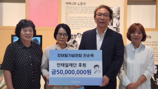 전순옥 전태일기념관 관장이 전태일재단에 개인 기부금 5천만원을 기부했다. 이를 기념하는 전달식은 9월 17일(화) 오전 9시 30분 전태일기념관에서 열렸으며, 박승흡 전태일재단 이사장, 박미경 전태일재단 사무총장, 최현미 중구노동자종합지원센터 센터장 등 재단 관계자들이 함께해 의미를 나눴다. 이번 기부는 지난해 전 관장이 전태일이소선장학재단에 5천만원을 기부한 데 이어 다시 전태일재단을 위해 내놓은 후원으로, 그 의미…