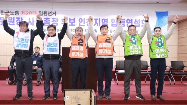 제28대 한국노총 임원선거 출마자들이 한국노총의 정치방침과 사회적대화 방향에 대해서 생각을 밝혔다. 한국노총 정기선거인대회 전국합동연설회가 10일 오전 10시 인천과 오후 2시 경기에서 잇달아 열렸다. △ 왼쪽부터 기호 1번 김만재·박해철, 기호 2번 김동명·류기섭, 기호 3…