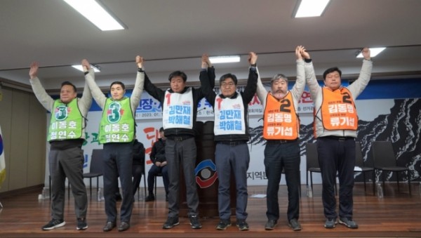 28대 한국노총 임원선거 출마자들이 현장과의 소통강화를 약속했다. 2023 한국노총 정기선거인대회 후보자 전국합동연설회가 12일 오전 10시 전북과 오후 2시 전남에서 잇달아 열렸다. △ (왼쪽부터) 기호 3번 이동호·정연수, 1번 김만재·박해철, 기호 2번 김동명·류기섭 후보…
