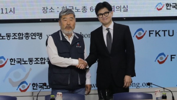 한국노총은 11월 19일(화) 오전 11시부터, 한국노총 6층 대회의실에서 국민의힘 한동훈 대표를 비롯한 지도부와 간담회를 개최하고, 노동자・서민을 위한 정책대안을 모색했다. 한국노총-국민의힘 지도부 간담회에서는 한국노총과 국민의힘이 공감하는 정책의제 (5인미만 사업…