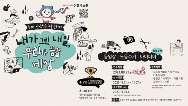 노동존중에 대한 가치를 확산시키며 대국민과의 소통 강화를 위한 공모전이 화제를 모으고 있다. 한국노총은 1,550만원의 상금을 걸고 개최하는 노동문화 콘텐츠 공모전 ‘난생처음노동문화제’를 10월 31까지 진행한다. ‘내가 그린 내일, 우리가 꿈꿀 세상’을 주제로 한 이번 공모전은 동영상…