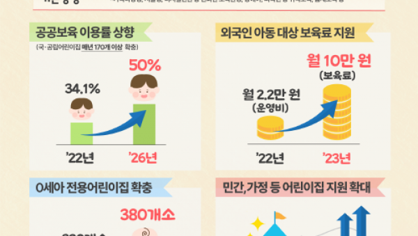 경기도가 올해부터 2026년까지 매년 국공립어린이집을 170개 이상 조성하고 현재 320곳인 0세아전용 어린이집을 2027년까지 380곳으로 늘리는 등 변화하는 보육환경에 부응하기 위한 41개 과제를 추진한다.그래픽보도자료경기도는 이런 내용을 담은 ‘제4차 경기도 중장기 보육발전계획(2023~2027년)’을 수립해 올해부터 시행에 나선다고 7일 밝혔다.이번 보육발전계획은 가족의 다양성, 저출생 등 보육환경의 변동과 취약 보육…