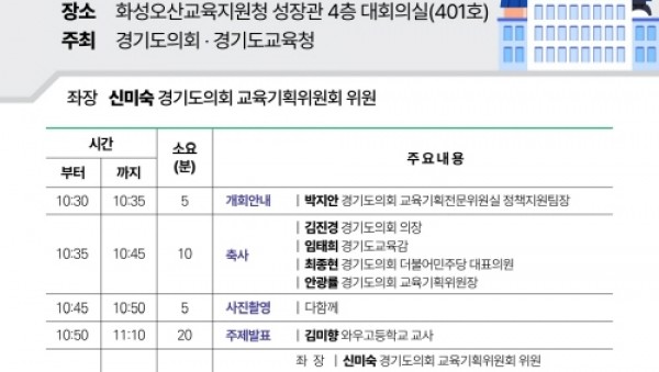 경기도의회 의원연구단체 「경기교육발전연구회」(회장 정하용 의원, 국민의힘, 용인5)가 지난 20일에 「초등학교 안전강화 및 범죄예방을 위한 정책제언 – 늘봄학교를 중심으로」라는 주제로 진행한 정책연구용역 최종보고회를 개최했다고 21일 밝혔다.250821 정하용 의원, 의원연구단체 경기교…