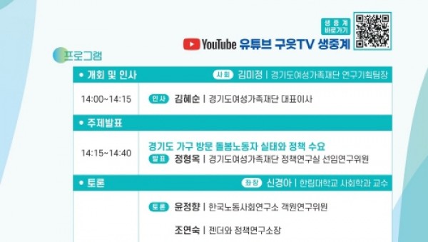 경기도여성가족재단이 오는 28일 오후 2시 ‘경기도 가구 방문 돌봄노동자 실태와 향후 과제’를 주제로 정책토론회를 개최한다.가구방문+돌봄노동자GPS+웹자보재단 유튜브로 중계되는 이번 토론회는 재단이 올해 중점 정책연구의 하나로 수행한 ‘경기도 가구 방문 돌봄노동자 실태조사’ 결과를 공유…