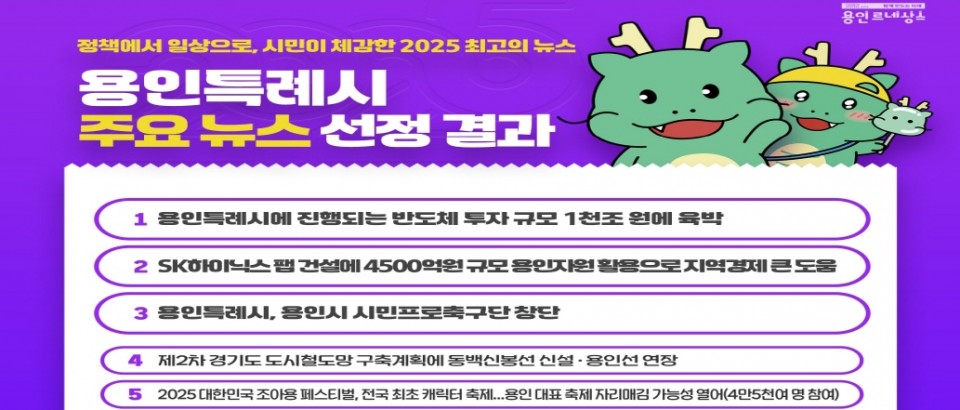 2025년 용인특례시 최고의 뉴스는 ‘반도체 투자 규모 1000조 원 육박’ - 주요 뉴스 선정에 2604명 참여…득표 순으로 1위부터 12위까지 선정 - - 2위는 ‘SK하이닉스 팹 건설에 4500억원 규모 용인자원 활용’, 3위는 '용인시 시민프로축구단 창단' - 한국노동교육신문 2025-12-29 10:36 가 본문내용 확대/축소 본문 2025년 용인특례시 최고의 뉴스는 ‘반도체 투자 규모 1000조 원 육박’ 2025년 용인특례시(시장 이상일)를 빛낸 최고의 뉴스로 '반도체 투자규모 1000조 원에 육박'이 뽑혔다. 2025 용인특례시 주요 뉴스 'SK하이닉스 팹 건설에 4500억 원 규모 용인 지역자원 활용’과 '용인시 시민프로축구단 창단'이 각각 2위, 3위를 차지했다. 시는 지난 16일부터 22일까지 일주일간 시민과 공직자, 언론인을 대상으로 올해 주요 뉴스를 선정하는 온라인 설문조사를 했다. 30개의 뉴스 후보 목록 가운데 5개를 선택하는 방식으로 가장 많은 표를 받은 순으로 1위부터 12위까지 주요 뉴스 순위를 매겼다. 설문조사엔 총 2604명이 참여했다. 올해의 주요 뉴스엔 반도체, 문화‧체육, 교통 등 다양한 분야의 뉴스가 선정됐다. 1위로 뽑힌 뉴스는 '반도체 투자 규모 1천조 원에 육박'으로 1337표를 받았다. 이어 'SK하이닉스 팹 건설에 4500억원 규모 용인 지역자원 활용'이 1104표를 받아 2위에 이름을 올렸다. '용인시 시민프로축구단 창단'과 '제2차 경기도 도시철도망 구축계획에 동백신봉선 신설·용인선 연장 반영'은 각각 985표와 974표를 받아 3위와 4위로 선정됐다. '2025 대한민국 조아용 페스티벌, 전국 최초 캐릭터 축제...용인 대표 축제 자리매김 가능성 열어'는 802표를 받아 5위를 기록했다. '세종포천고속도로 동용인IC(가칭) 연결허가 국토교통부 최종 승인'은 704표를 받아 6위에 올랐다. '문화를 사랑하는 시민들에게 더 좋은 공연 제공 위해 포은아트홀 새롭게 조성'은 497표를 받아 7위, '시 대표 캐릭터 조아용, 2025 대한민국 캐릭터 어워즈 대상 수상'은 487표를 받아 8위로 뽑혔다. '첨단산업과 복합문화 중심도시 경기용인 플랫폼시티 착공'은 295표를 받아 9위를, '전국 최초 초중고 맞춤형 학교 제설지도 제작'는 270표를 받아 10위를 기록했다. '장애인 등 우선배려 주유서비스 이동약자 위한 생활밀착형 모범사례로 평가'는 254표를 받아 11위, '반도체 특화도시 이동공공주택지구 국토부서 지정 고시'는 204표를 받아 12위로 나왔다. ▲‘7년 연속 경기도 도서 대출 1위’ ▲‘삼가2지구 임대주택 문제 해결 기대’ ▲‘공공 수영장 두 배 이상 증가’ ▲‘제2회 대한민국 대학연극제 개막’ ▲‘SERI PAK with 용인’ ▲‘공동주택 건설 부실 방지 대책 마련’ 등 다양한 뉴스도 후보에 올랐으나 워낙 큰 뉴스들이 많아 주요 뉴스 순위에는 들지 못했다. 이상일 시장은 “올해에도 용인특례시는 반도체·문화·교통 등 여러 분야에서 참으로 많은 성과를 냈다”며 “용인 발전과 시민 생활향상에 필요한 여러 일들을 잘 수행해 주신 시의 모든 공직자들, 힘과 지혜를 많이 보태주신 시민들께 감사인사를 드린다"라고 말했다. 이 시장은 "용인시가 올해 성취한 일들에 대해 시민들께서 직접 평가해 주신 뉴스들이어서 특별한 의미가 있다고 생각한다"며 "시는 내년에도 성심성의를 다해 시민을 위한 일들을 하겠다"고했다. 한국노동교육신문 기자의 다른기사 보기 목록 댓글목록 이전글 ‘용인 첨단시스템반도체 국가산업단지’, LH-삼성전자 산업시설용지 분양계약 체결 완료 25.12.29 다음글 이상일 용인특례시장, 구윤철 경제부총리에게 용인의 반도체 국가산단 지원 요청 25.12.29