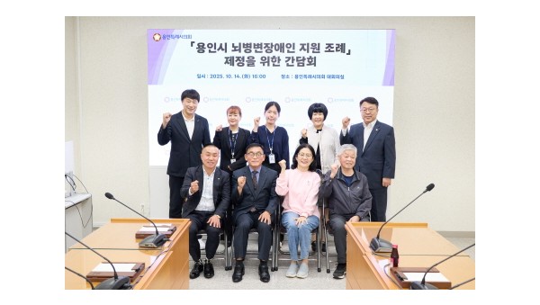용인특례시의회 윤원균 의원(상현1동·상현3동/더불어민주당)은 14일 의회 대회의실에서 ‘용인시 뇌병변장애인 지원 조례’ 제정을 위한 간담회를 개최했다. 용인시 뇌병변장애인 지원 조례 제정을 위한 간담회 참석자들이 기념촬영을 하고 있다.이번 간담회는 뇌병변장애인의 권리 보장과 삶의 질 향상, 자립 지원을 위한 제도적 근거 마련을 논의하기 위해 마련된 자리로, 관련 기관 및 전문가, 시민대표가 함께해 다양한 의견을 나눴다…