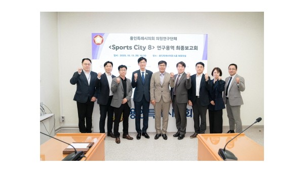 용인특례시의회 의원연구단체 ’Sports City(스포츠시티) 8‘(대표 임현수)은 13일 의회 대회의실에서 연구용역 최종보고회를 개최했다. 의원연구단체 'Sports City 8' 회원들과 연구용역 최종보고회 참석자들이 기념 촬영을 하고 있다.이번 연구는 ’시민과 함께하는 지속가능한 프로스포츠 문화 정착‘을 목표로 지난 6월부터 약 4개월간 진행됐으며, 이날 보고회는 연구 성과를 공유하고 향후 추진 과제를 점검하기 …