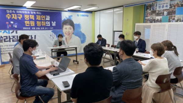 더불어민주당 정춘숙 의원(경기 용인시병·재선)은 6월25일(토) 경기도 용인시 수지구 사무실에서 ‘수지구 정책제언과 민원청취의 날’을 개최했다. 주민들의 민원과 정책제안을 청취하기 위해 정춘숙 의원을 비롯하여 김은주 경기도의원(교육기획위)과 윤원균 용인시의원(자치행정위원장), 장정순 용인시의원(문화복지위원장), 이교우·이윤미 용인시의원 당선인이 참석하여 주민들과 함께 해결방안을 모색했다. 이날 …