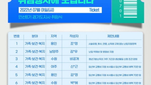 민선 8기 경기도지사직 인수위원회 공식 홈페이지인 ‘똑톡! 경기제안’에 ‘우수 정책’을 제안한 도민 11명이 다음 달 1일 열리는 김동연 경기도지사 취임식에 공식 초청된다. 참고 이미지1 인수위는 지난 15일부터 26일까지 ‘똑톡! 경기제안’을 통해 현재까지 총 1천338건의 정책을 제안받았으며(26일 14시 기준) 이 중 8개 주제의 우수정책을 제안한 11명을 ‘우수정책 제안자’로 선정, 취임식에 공식 초…