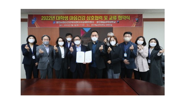 용인시 자살예방센터(센터장 김한성)가 3일 용인예술과학대학교(총장 최성식)와 대학생들의 정신건강과 생명존중문화 조성을 위해 업무협약을 체결했다. 용인시 자살예방센터와 용인예술과학대학교 관계자들이 3일 협약식에서 기념촬영을 하고 있다. 이번 협약에 따라 양 기관은 대학생들의 정신건강 증진을 도모하고 자살예방과 생명존중문화 조성을 위한 네트워크를 구축하기로 했다. 특히 센터는 생명존…