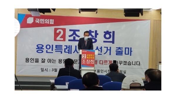 조창희 국민의힘 경기도당부위원장 (전 용인시의회의원 재선,경기도의회의원)은 31일 용인시청 브리핑실에서 기자회견을 갖고 국민의 열망으로 정권교체가 이루어졌고 이에 맞추어 지방정치도 새롭게 시작하고 변해야 한다는 마음과 의지로 제8회 전국동시지방선거 용인특례시장 출마 선언을 했다. 출마선언조창희 전 의원은 용인특례시에 맞는 행정과 시정 운영이 필요하고 지방정치의 능력과 경험이 풍부한 일꾼이 있어야 하며 이번 대…