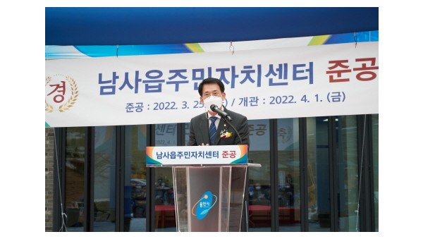 용인시 처인구 남사읍은 25일 행정복지센터 부지 오른편에 주민자치센터를 증축하고 준공식을 가졌다. 정식개관은 오는 4월 1일부터다. 용인시 처인구 남사읍은 25일 행정복지센터 부지 오른편에 주민자치센터를 증축하고 준공식을 가졌다.백군기 용인시장이 25일 처인구 남사읍 주민자치센터 준공식에 참석해 축사를 하고 있다 이날 행사엔 백군기 용인시장, 김기준 용인시의회 의장, 관내 38개 …