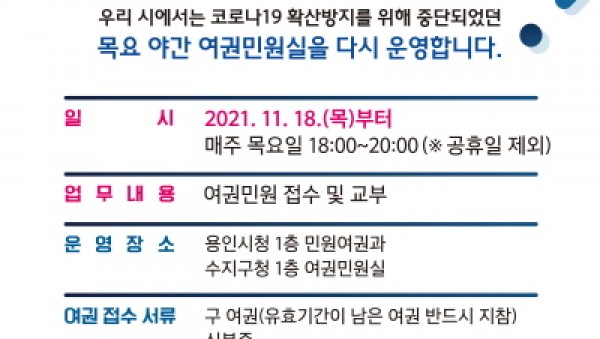 용인시가 오는 18일부터 코로나19 확산 차단을 위해 잠정 중단했던 야간 여권민원실 운영을 재개한다. 지난해 3월 여권민원실 운영을 중단한 지 20개월 만이다. 목요 야간 여권민원실 운영 재개 안내 포스터 야간 여권 민원창구는 매주 목요일 오후 6시부터 8시까지 용인시청 1층 민원여권과와 수지구청 1층 여권민원실에서 운영한다. 여권 신청접수와 심사 및 교부 업무 등이 진행되며…