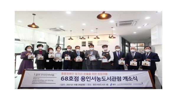용인시 중증장애인 일자리 창출을 위한 카페 아이갓에브리씽(I got everything) 용인서농도서관점이 26일 개소했다. 백군기 용인시장이 26일 카페 아이갓에브리씽 용인서농도서관점 개소식에 참석해 관계자들과 기념촬영을 하고 있다. 용인시 서농도서관 3층에 위치한 카페 아이갓에브리씽은 용인시와 한국장애인개발원, (사)한국지체장애인협회가 함께 마련한 곳이다. 앞서 한국지체장애인협회가 한국…