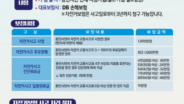 # 지난 4월 A씨는 운학동 자전거도로를 달리다 넘어져 어깨를 다쳤다. 염좌로 인한 물리 치료 등 치료비 걱정이 앞섰지만 ‘용인시민 자전거 보험’의 도움을 받을 수 있었다. # B씨는 지난 7월 정평천에서 자전거를 타던 중 넘어져 팔 아랫부분을 다쳤다. 적지 않은 치료비가 나올 것을 걱정했지만, 시의 자전거 보험을 활용해 의료보험을 제외한 병원비 자부담액을 대폭 줄일 수 있었다. 용인시는 17일 ‘용인시민 자…