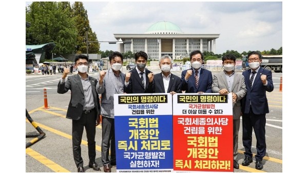 이낙연 더불어민주당 대선 경선 예비후보가 국회 세종의사당 건립을 촉구하는 시위 현장을 방문해 국회법 개정안 연내 통과처리 의지를 밝혔다. 세종의사당 건립 시위1이 후보는 20일 국회 정문 앞 국회 세종의사당 건립법(국회법 개정안) 통과를 촉구하는 릴레이 1인시위 현장을 찾아 참가자들을 격려했다. 현장에는 법안을 대표발의한 홍성국 세종갑 의원이 동석했다. 세종의사당 건립 시위2이 후보는 “총리 재임 시절…