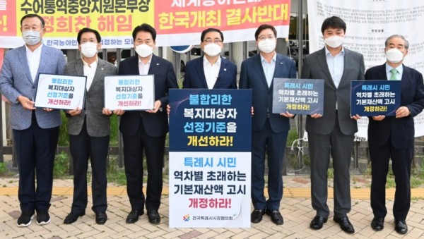 용인시의회 김기준 의장은 14일 세종특별자치시 보건복지부 앞에서 특례시 시장 및 의장들과 함께 사회복지 특례권한 확보를 위한 기본재산액 고시 개정을 촉구하는 성명서 발표 및 1인 시위를 진행했다. 이 자리에는 김기준 의장을 비롯해 백군기 용인시장, 허성무 창원시장, 염태영 수원시장, 조석환 수원시의회 의장, 이치우 창원시의회 의장 등 특례시 관계자들이 함께했다. 그동안 용인을 비롯한 …