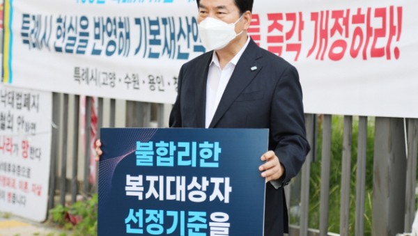 전국특례시시장협의회(이하 협의회)는 14일부터 보건복지부(정부세종청사) 앞에서 창원시장을 시작으로 기본재산액 고시 개정을 촉구하는 릴레이 1인 시위를 진행했다. 이 자리에는 4개 특례시 시장인 협의회 대표회장 허성무 창원시장을 비롯해 염태영 수원시장, 백군기 용인시장, 조석환 수원시의장, 김기준 용인시의장, 이치우 창원시의장 등 4개 특례시 관계자들이 함께했다. 이들은 1인 시위에 앞서 100만 대도시 시민의…