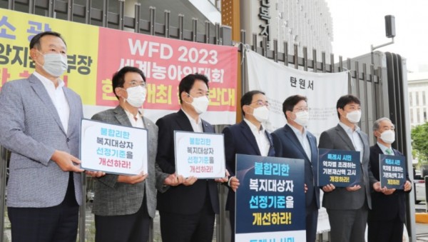 백군기 용인시장이 14일 사회복지 특례권한 확보를 위해 사회복지급여 기본재산액 기준개선을 촉구하는 성명서를 내고 1인시위에 돌입했다. 이날 백 시장을 비롯해 허성무 창원시장, 염태영 수원시장, 김기준 용인시의회 의장, 조석환 수원시의회 의장, 이치우 창원시의회 의장 등 4개 특례시 시장과 시의회 의장들은 보건복지부 청사 앞에서 성명서를 발표하고 릴레이로 1인시위를 진행했다. &nb…