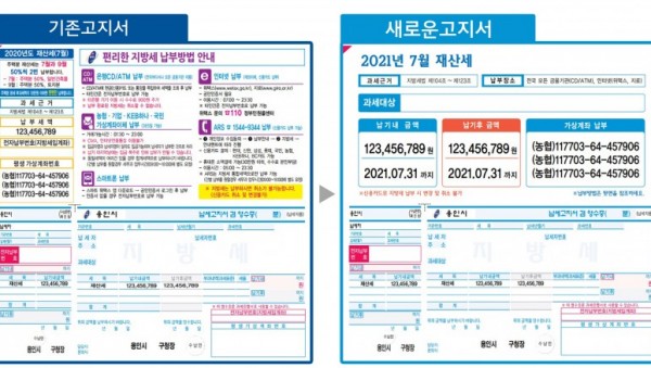 용인시는 6일 납세자 누구나 읽기 쉽도록 ‘주택 및 건축물 재산세 납세고지서’를 새로 디자인해 발부했다고 밝혔다. 납세액, 기한 등 고지서 주요 내용을 한눈에 볼 수 있도록 하기 위해서다. 기존 고지서는 활자가 작고 주요 내용을 한 번에 파악하기 어렵다는 민원인들의 지적이 있었다. 이에 시는 고령층도 읽기 편하게 활자를 2.3배 크게 하고, 세액·납부금액·납…