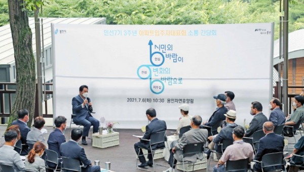 백군기 용인시장이 6일 용인자연휴양림 내 야외무대에서 관내 아파트입주자 대표들과 소통간담회를 갖고 다양한 의견을 나누는 시간을 가졌다. 이날 간담회는 민선7기 3주년을 맞아 용인시민의 60% 이상이 거주하고 있는 아파트의 입주자대표들과 함께 살기 좋은 주거환경을 만드는 방법을 모색하고자 마련했다. 이 자리에는 백 시장과 처인·기흥·수지구에 위치한 16개 아파트입주자 대표 1…