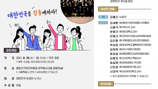 중앙선거관리위원회 선거연수원은 민주주의 발전에 기여하는 정치․사회지도자 양성과정인「제14기 민주시민정치아카데미」수강생 30명을 모집한다. 대한민국 유권자라면 누구나 5월 3일부터 6월 30일까지 선거연수원 홈페이지 (www.civicedu.go.kr)에서 신청할 수 있으며, 8월 18일부터 12월 1일까지 15주 동안 매주 수요일 오후 7시부터 8시 40분까지 중앙선거관리위원회 관악청사(서울특별시…
