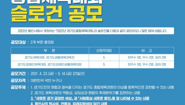 용인시가 23일부터 다음달 14일까지 ‘2022년 경기도종합체육대회’의 슬로건을 공모한다. 2022년 경기도종합체육대회 슬로건 안내 포스터 이번 슬로건 공모는 경기도종합체육대회의 적극적인 관심과 참여를 이끌어 내기 위해 진행, 용인시민과 경기도민은 물론 대한민국 국민이라면 누구나 참여할 수 있다. 공모는 경기도체육대회·경기도생활체육대축전 부문과 경기도장애인체육대회·경기도장애…