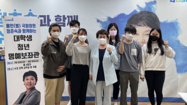 정춘숙 더불어민주당 국회의원(경기 용인병, 재선)은 지난 7월 15일 지역 사무실에서 ‘정춘숙과 함께하는 청년·대학생 명예보좌관 4기’를 개최했다. ‘정춘숙과 함께하는 청년·대학생 명예보좌관 4기’는 정춘숙 국회의원을 비롯해 국회의원 보좌진, 용인시 시의원 등 현…
