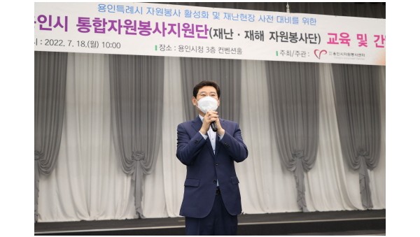 용인시자원봉사센터(이사장 이상일)가 18일 재난현장 사전 대비를 위한 통합자원봉사단 교육 및 간담회를 진행했다.이상일 용인시장이 18일 열린 용인시통합자원봉사단 교육 및 간담회에 참석해 인사말을 하고 있다. 이날 용인시청 컨벤션홀에서 열린 교육은 지난해 6월 출범한 …