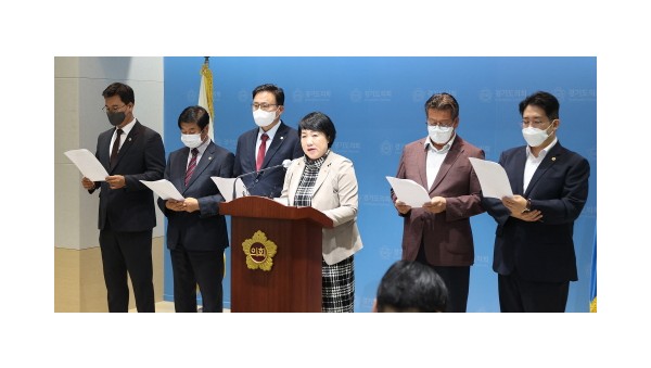 지난달 30일 집중호우로 취소됐던 김동연 경기도지사의 취임식을 오늘 개최한다고 한다. 7월 15일(금) 기자회견_왼쪽부터 유형진(광주4), 김상곤(의정부1), 지미연(용인6), 안명규(파주5), 김현석(과천1)경기도의회 국민의힘(대표의원 곽미숙, 고양6)은 도민과 소통…