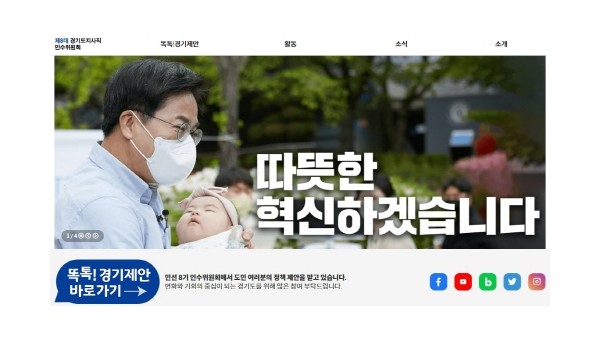 민선 8기 경기도지사직 인수위원회 공식 홈페이지가 본격 운영된다. 참고이미지1 공식 홈페이지는 민선 8기 인수위의 주요 활동을 홍보하는 기능 이외에도 김 당선인과 민선 8기에게 바라는 정책을 자유롭게 제안할 수 있는 ‘도민 소통 창구’ 역할을 수행할 예정으로, 인수위…