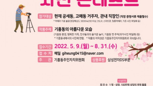 용인시 기흥구 기흥동이 오는 8월31일까지 ‘제2회 기흥동 스토리 사진 콘테스트’ 참여자를 모집한다고 15일 밝혔다. 기흥동 사진콘테스트 포스터 지난해에 이어 두 번째로 열리는 이 행사는 기흥동에서의 아름다운 추억을 주민들과 함께 나누기 위해 주민자치센터(위…