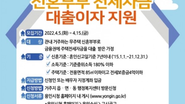 용인시는 오는 5일부터 15일까지 무주택 신혼부부들을 대상으로 전세자금 대출이자 지원 신청을 받는다고 1일 밝혔다. . 신혼부부 전세자금 대출 이자 지원 신청 안내 포스터 대상은 월 소득이 기준 중위소득 180% 이하(2인가구 기준 586만원)인 전세…