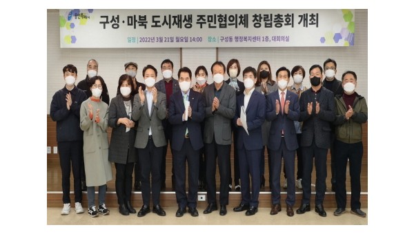 용인시 기흥구 구성‧마북동 일원 5만5031㎡에 추진되는 도시재생사업에 본격 시동이 걸렸다.백군기 용인시장이 21일 열린 구성 마북동 도시재생 주민협의체가 창립총회에서 참석자들과 기념촬영을 하고 있다. 용인시는 구성‧마북동 도시재생사업의 성공적인 추진을 위해 주민협의…