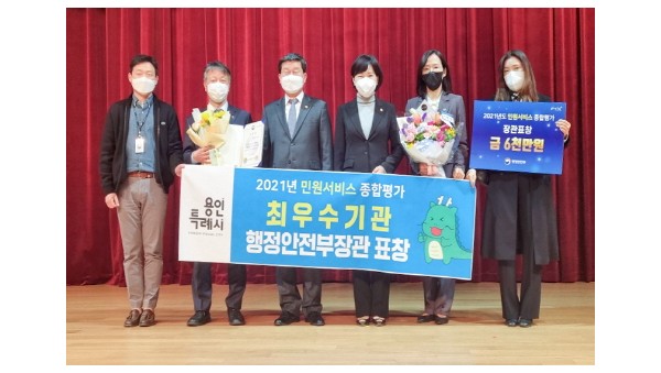 용인시가 ‘2021년 민원서비스 종합평가’에서 최우수기관으로 선정, 행정안전부 장관 표창과 함께 특별교부세 6천만원을 확보했다.16일 국세청에서 열린 '2021년 민원서비스 종합평가' 시상식에서 이희준 용인시 제1부시장(왼쪽 두번째)과 전해철 행정안전부 장관(왼쪽 세번째), 전현희 국민…