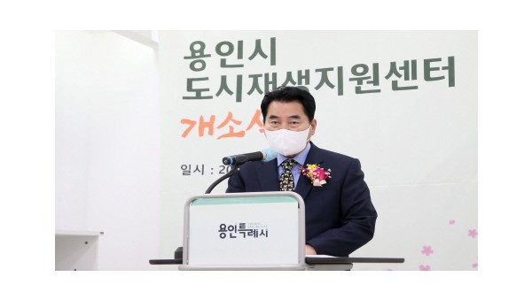 ‘용인시 도시재생지원센터’가 문을 열고 성공적인 용인형 도시재생 추진을 위한 첫 발을 내디뎠다. 백군기 용인시장이 15일 용인시 도시재생지원센터 개소식에서 인사말을 하고 있다. 용인시에 따르면 시 도시재생지원센터는 15일 기흥구 중동 쥬네브문월드 B1…