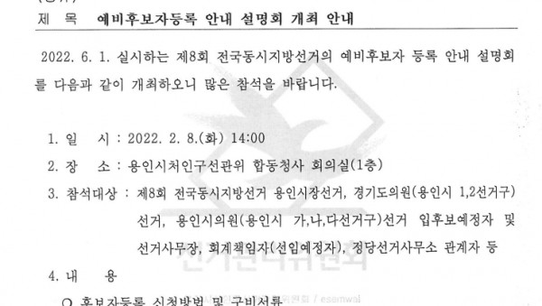 제8회 전국동시지방선거 입후보예정자를 위한 예비후보자등록 안내 설명회 개최