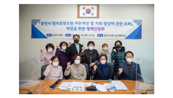용인시의회 장정순 의원(풍덕천1·동천동/더불어민주당)은 지난 20일 오후 4시 의회 4층 대회의실에서 ‘용인시 장기요양요원 처우개선 및 지위 향상에 관한 조례 제정을 위한 정책 간담회’를 열었다.장정순 용인시의원, 장기요양요원 처우 개선 정책 간담회 열어 &nbs…