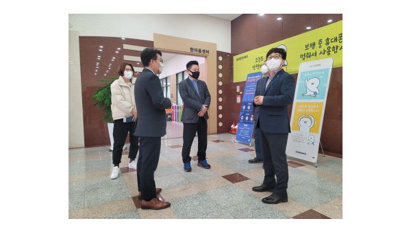 손상훈 기흥구청장이 21일 용인시 기흥구 농서동에 있는 삼성전자 기흥사업장을 방문해 지역 상생 발전을 위한 협력사업에 대해 논의했다. 손상훈 기흥구청장(사진 오른쪽 첫번째)이 삼성전자 기흥사업장 내 위치한 현장민원실을 살펴보고 나와 관계자들과 이야기를 나누고 …