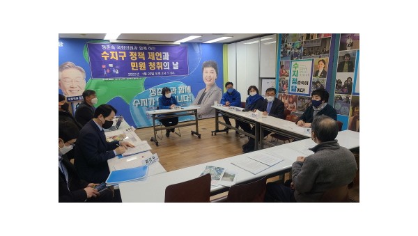 더불어민주당 정춘숙 의원(경기 용인시병·재선)은 1월 22일(토) 경기도 용인시 수지구 사무실에서 ‘수지구 정책제언과 민원청취의 날’을 개최했다. 주민들의 민원과 정책제안을 청취하기 위해 정춘숙 의원을 비롯하여 유영호 경기도의원(여성가족평생교육위·예결위), 김은주 경기도의원(…