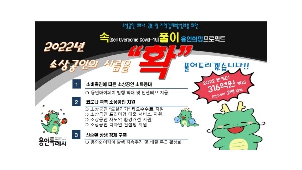 용인시가 코로나19 장기화로 고통받는 소상공인을 지원하고 침체된 지역경제를 활성화하기 내년도 예산을 대폭 확대했다.속(SOC)풀이 용인희망프로젝트 홍보 배너 시는 21일 소상공인의 자립을 지원하고 소비 촉진을 바탕으로 선순환 상생 경제 구축을 목표로‘속(SOC)풀이 …