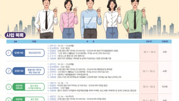 용인시가 청년 취업난 해소를 위해 내년에‘청!바!지!(용인 청년들이 바라는 삶을 지원하는)’일자리 사업을 본격 추진한다. 2022년 용인시 청년일자리 사업 안내 시는 22일 코로나19로 취업에 어려움을 겪는 청년들을 위해 내년에 2개 분야 5개 세부 사업에서…