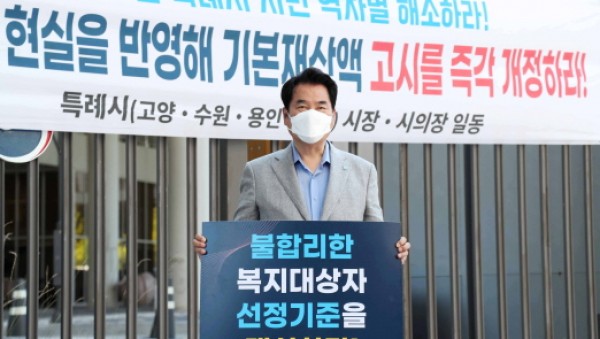 특례시의 사회복지급여 기본재산액 기준이 ‘대도시’로 상향되면서 1만여 명의 용인시민이 추가 복지혜택을 받게 됐다. 관련 고시 개정을 위해 연구용역을 진행하는 등 용인시가 1년에 가까운 노력 끝에 얻은 값진 결실이다.백군기 용인시장이 7월 27일 보건복지부 앞에서 기본재산액 고시 개정을 …
