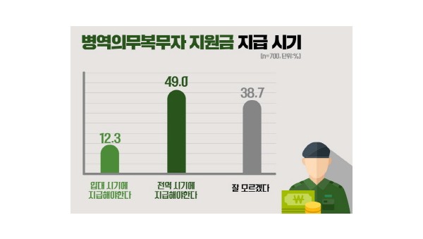 용인시의회 정한도 의원은 19일 여론조사 결과 용인시민들이 병역의무자의 군 복무에 대한 용인시 지원정책으로 입대시기에 지급하는 입영지원금보다 전역 시기에 지급하는 전역사회복귀지원금을 더 선호하는 것으로 나타났다고 밝혔다.1.병역복무자 지원금 지급 시기 2.전역사회복귀지원금 지급…