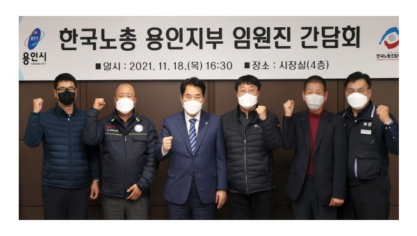 백군기 용인시장은 18일 시장 접견실에서 노동자 권익증진과 상생하는 노사문화 조성을 위한 의견을 듣기 위해 한국노총 용인지부 임원들과 간담회를 가졌다.백군기 시장은 18일 시장 접견실에서 노동자 권익 증진과 상생하는 노사문화 조성을 위한 의견을 듣기 위해 한국노총 용인지부 임원들과 간담…