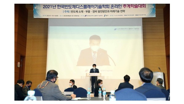 용인시와 한국반도체디스플레이기술학회가 공동 주최하는 ‘2021 추계 학술대회’가 18일 용인시 문화예술원 국제회의실과 전시실에서 열렸다.백군기 시장이 18일 용인시 문화예술원 국제회의실에서 열린 한국반도체디스플레이기술학회 추계학술대회에서 축사를 하고 있다. 이날 대회…