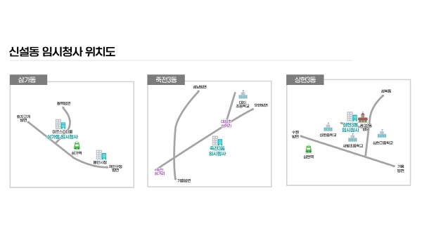 용인시 처인구 삼가동과 수지구 죽전3동·상현3동이 9월 6일부터 본격 업무에 들어간다.용인시 신설동 임시청사 약도 시는 인구 과대동인 처인구 역삼동(4만4675명)과 수지구 죽전1동(5만6882명)·상현1동(4만8649명)을 각각 분동해 삼가동, 죽전3동, 상…