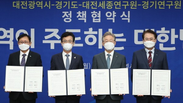 경기도가 대전광역시와 첨단과학 인프라를 활용해 새싹기업(스타트업) 지원을 강화하는 등 양 지역 현안 공동 대응과 지역이 주도하는 국가 균형발전 선도를 위해 협력을 약속했다. (사진자료2)경기도-대전광역시 정책협약식 이재명 경기도지사와 허태정 대전시장, 이한주 경기연구…